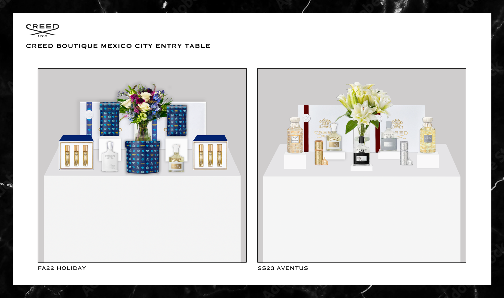 VM direction for Creed Mexico City boutique’s entry table. Setup is updated to align with focus period visuals. FA22 Holiday features the ‘22 holiday leather collection, key sets and gift wrapping. SS23 Aventus was a focus period on best-selling fragrance Aventus, with a secondary focus on Aventus for Her and Aventus Cologne.