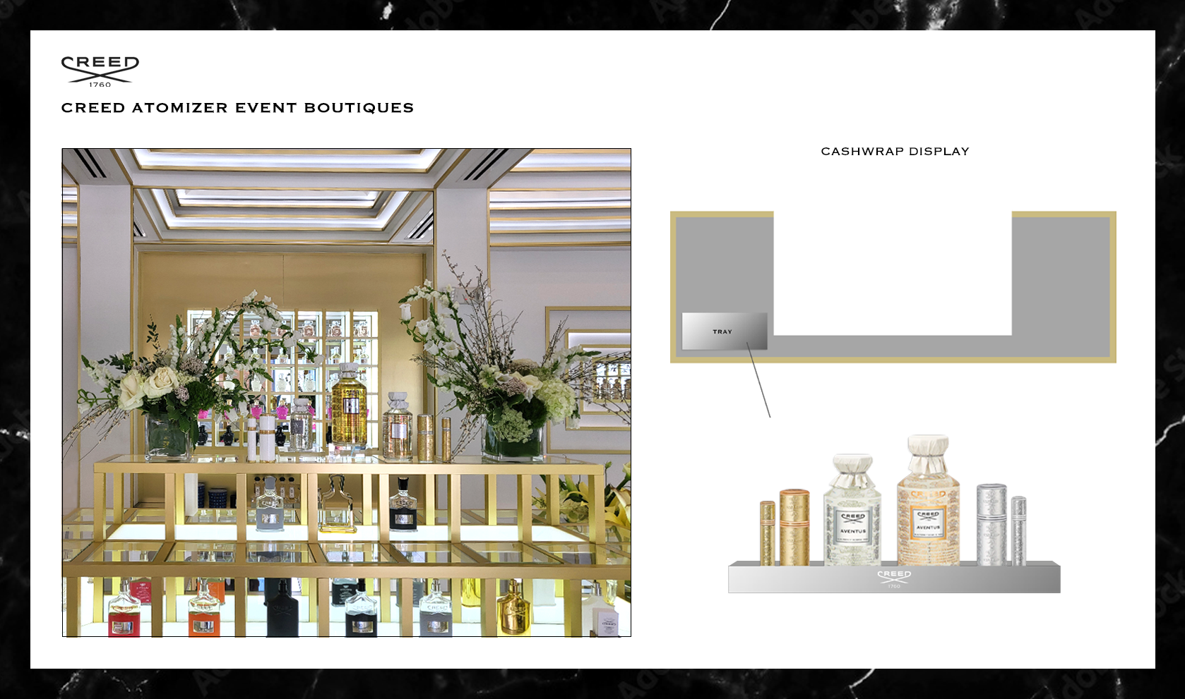 Boutique top of cage schematics for The House of Creed annual atomizer event. Executed in all 10 boutiques in North America, arranged floral deliveries in all markets and secured necessary items to execute visual (risers, trays, product etc).